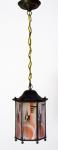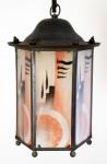 A decorative Dutch art deco pendant light with metal frame retaining its original colored glass panels