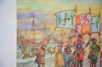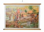 Vintage pull down school chart Columbus neemt Guanahani in bezit, 12 oktober 1492