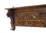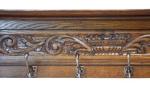 Antique Dutch carved wall mounted wooden coat rack with four double and two metal hooks