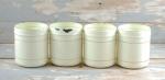 Set of four four small spice canisters in cream enameled steel with green letters and gold colored lines