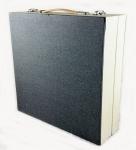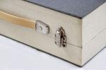 The case has a beautiful blueish/grey color plastic handle and chrome clasps
