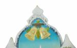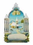 Cardboard embossed wall decoration with church and bells winter mountain landscape